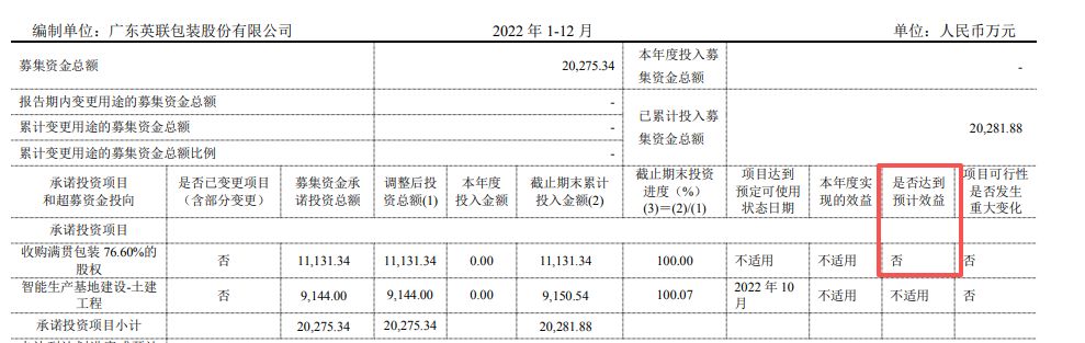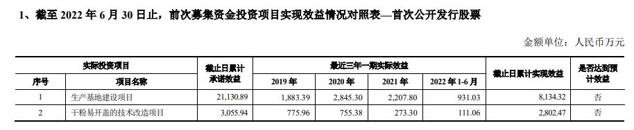 然而,英联股份 IPO 募投的生产基地建设项目和干粉易开盖的技术改造项目投产后,在效益上均未达预期。比如生产基地项目在 2019 年-2022 年 6 月,累计承诺效益应为 2.11 亿元,但其实际仅实现效益 0.81 亿元。