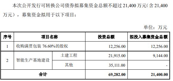在公司 2019 年可转债募投项目中,拟募集资金约 2.13 亿元,其中 1.23 亿元用于收购满贯包装 76.6% 的股权,0.91 亿元用于智能生产基地建设项目中的土建工程。