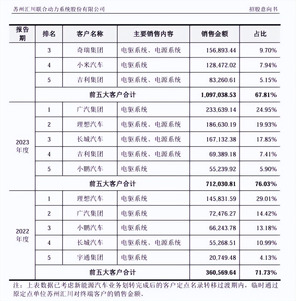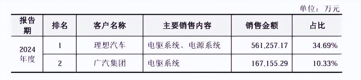 招股书显示,2022 年至 2024 年,联合动力对前五大客户合计销售金额为 36.1 亿元、71.2 亿元和 109.7 亿元,占总营收比例为 71.73%、76.03% 和 67.81%。其中,理想贡献收入占总营收比例为 29.01%、19.93%、34.69%,分别是公司的第一大、第二大和第一大客户。