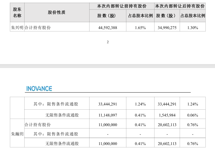 天眼查显示,前述汇川投资 21.7029% 股权已于 2022 年完成过户登记。相应的股份赠与,朱兴明分别于 2024 年 12 月、2025 年 9 月以大宗交易方式,向朱瀚玥转让公司股份 11,000,000 股、9,602,113 股,内部转让均价为 62.06 元/股、80.14 元/股。