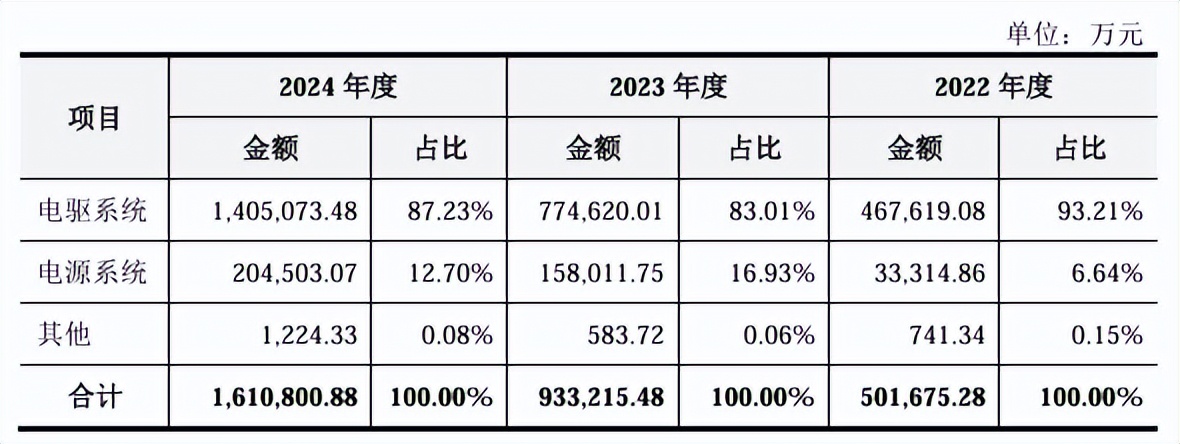 从具体业务来看,电驱系统产品成为联合动力的主力营收来源。2022 年至 2024 年,电驱系统业务实现营收占总收入比例为 93.21%、83.01%、87.23%。