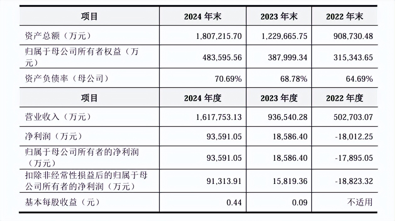 招股书显示,2022 年至 2024 年,公司实现营收 50.27 亿元、93.65 亿元、161.78 亿元;归母净利润-1.8 亿、1.86 亿元、9.36 亿元。