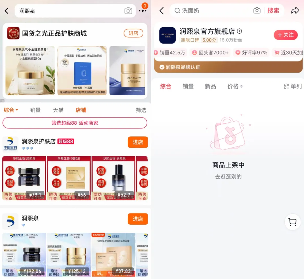 虽然华熙生物二季度业绩回暖,净利润率改善,但改革带来的阵痛也传导至经营端。随着华熙生物旗下润熙禾和润熙泉两大品牌相继关停,天猫、抖音旗舰店商品都已清空。