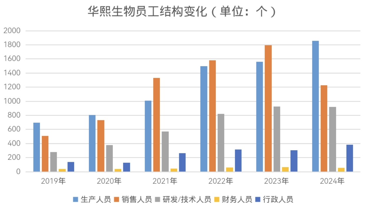 截至 2024 年,华熙生物年报显示公司在职员工总数为 4444 人,同比减少 211 人,降幅达 4.53%。人员结构变动中,销售团队缩减最为显著,人数同比下降 31.78%,共减少 571 人;财务人员减少 14 人,降幅为 20.59%,研发与技术人员也略有调整。