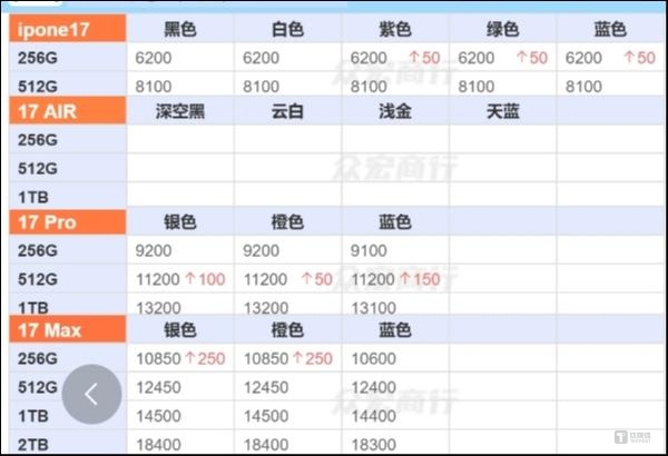 作者从一名华强北商家拿到的报价表显示,iPhone17 标准版的溢价在 100-200 元,Pro 溢价在 200 元,但蓝色版本溢价要低 100 元。溢价最高的还是 Pro Max,在 500-1000 元左右,其中 256GB 版本溢价最高,蓝色版本的则要低个 100-300 元。