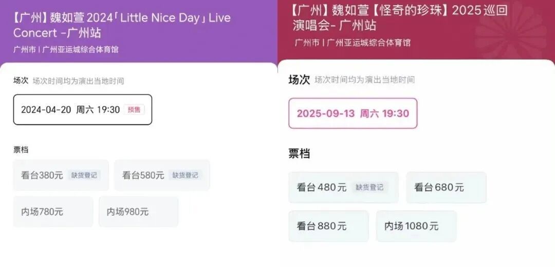去年,魏如萱在广州亚运城综合体育馆开过,当时的看台票 380 元起,最高内场票 980 元,但临近开演两周,780 元和 980 元的两档内场票尚未售罄。而在今年,同一个场地的票价同步上涨 100 元,定价在 480 元至 1080 元区间。当下经济环境下,对普通粉丝而言偏高,叠加周边消费后开支较大,可能会让部分潜在购票人群望而却步。