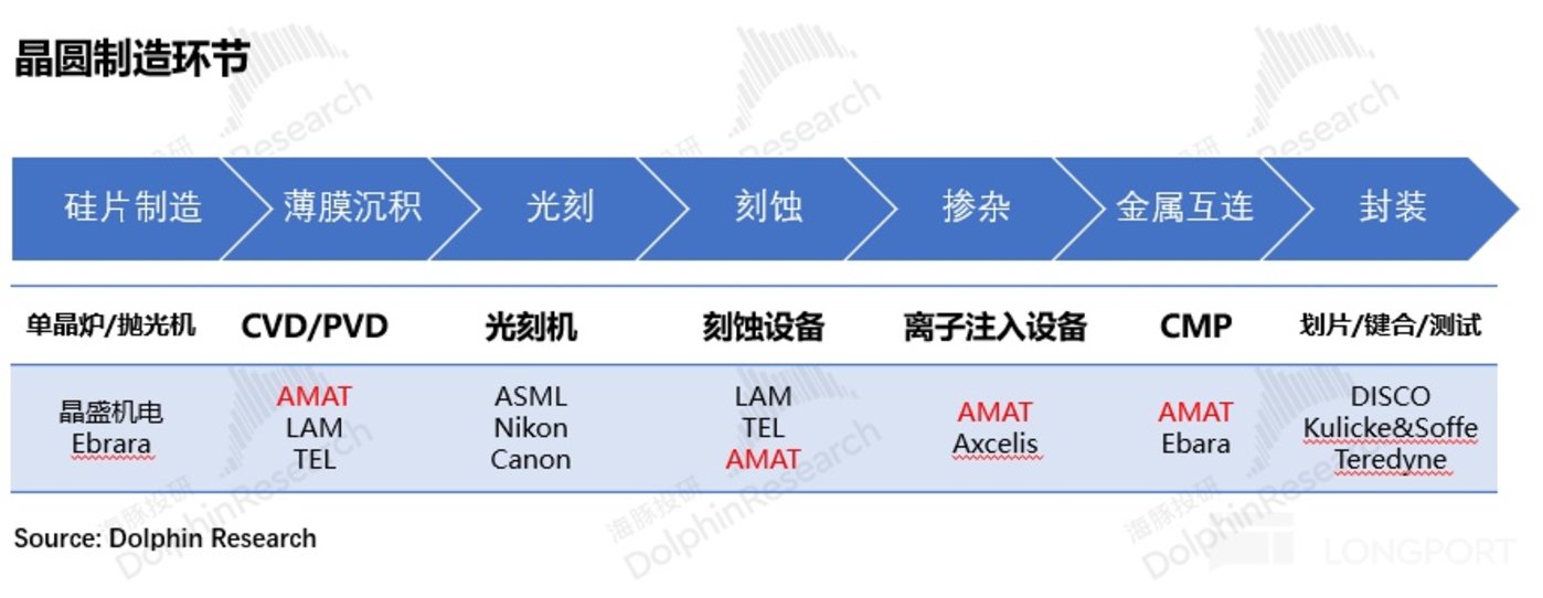 b) 丰富完善的产品体系:在半导体制造环节中,应用材料 AMAT 能提供一系列的产品,包括扩散炉、刻蚀设备、CVD、PVD、ALD、CMP、离子注入设备等,覆盖了从材料的创建、成型到改性、分析等工艺步骤,是全球唯一能提供整线解决方案的设备商。