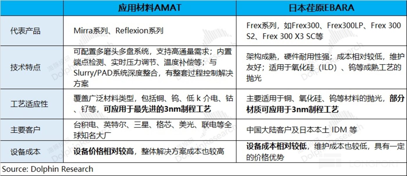 将两家公司的 CMP 产品进行对比,可以看出应用材料 AMAT 的 CMP 设备更为领先。公司能提供 Mirra(专注于 150-200mm)、Reflexion(专注于 300mm) 两大技术平台,基本可以满足各类型材料的需求,并能应用于最先进的 3nm 制程工艺,而日本 EBARA 的 CMP 产品只能适用于部分材质。