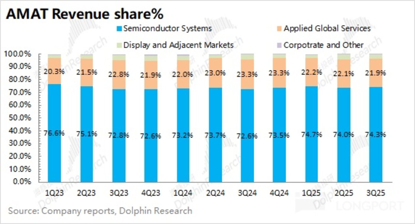 从应用材料 (AMAT.O) 的业务构成看,公司依然是一个纯粹的半导体设备公司。目前公司近 8 成的收入来自于半导体、显示面板等相关设备,而其余的 2 成是设备维护、零部件用量管理等相关服务收入。因而实际上,应用材料的全部收入都围绕于设备的销售和售后相关服务。