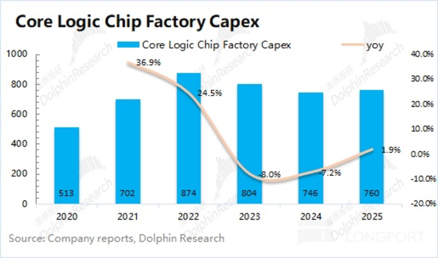 整体来看,海豚君预期七大核心逻辑芯片厂商的资本开支合计为 760 亿美元左右,同比增长 1.9%。