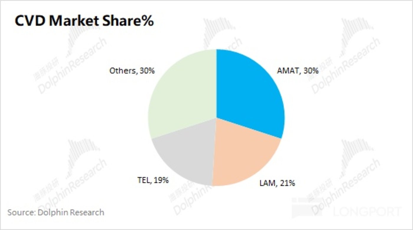 ②化学气相沉积 CVD 设备:类似 「用气体在硅片表面 『吹』 出薄膜」,适合镀绝缘层。应用材料 AMAT 处于第一梯队,相对领先。全球的 CVD 设备市场空间约 130 亿美元,应用材料的市场份额约为 30%,与 LAM(21%)、TEL(19%) 同处于第一梯队,仍有一定的优势。