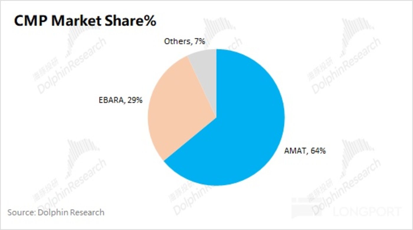 在 CMP 设备领域,应用材料 AMAT 也是拥有绝对领先的地位,占据了 60% 以上的市场份额。竞争对手主要是日本荏原 EBARA,两家公司合计占据了 9 成以上的市场份额。