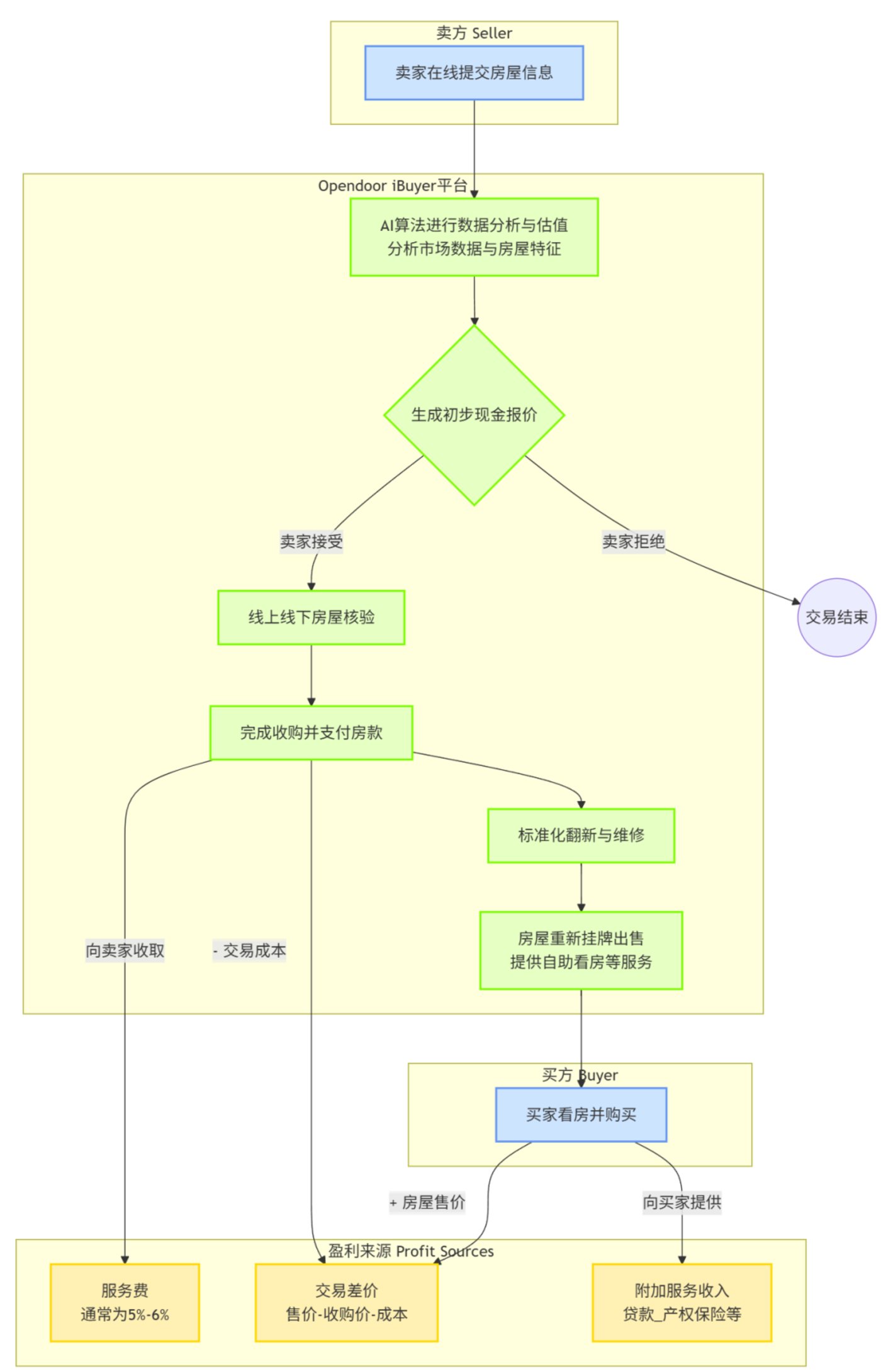 Opendoor 的 iBuyer 模式构建了一个高效、闭环的房产交易流程,其核心在于利用 AI 技术实现规模化运营,重塑了传统房产交易的价值链。
