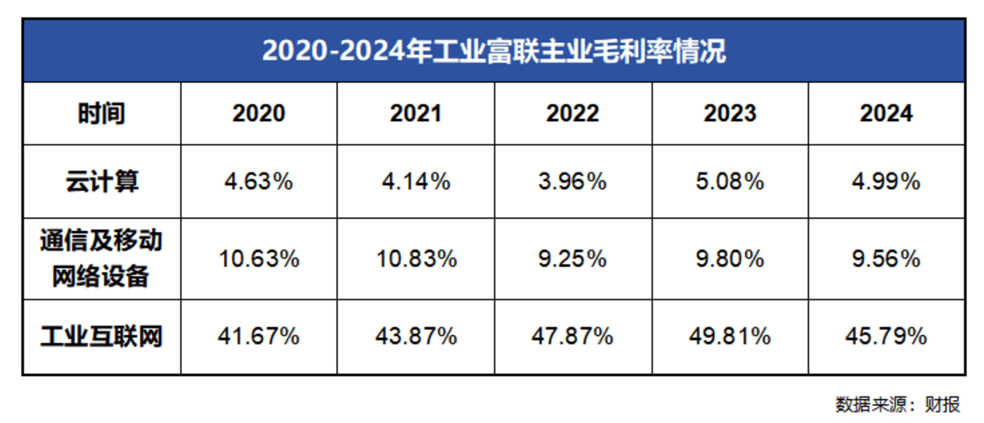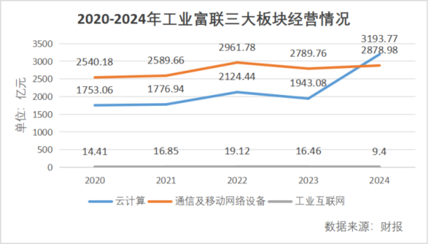 年报信息显示,工业富联整体业务由云计算、通信及移动网络设备、工业互联网三部分构成。按照 2024 年财报数据,云计算板块以 52.43% 的营收占比构成主线,通信及移动网络设备次之 (47.26%),工业互联网收入相对较少 (0.15%)。