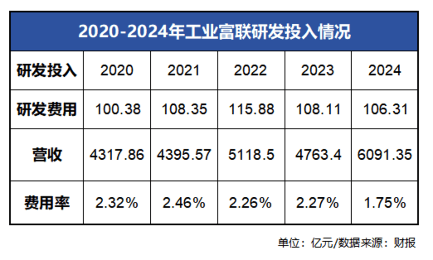 财报数据显示,自 2020 年以来,工业富联的研发费用率一直没有超过 2.5%,而且 2024 年研发费用率已经降至 2% 以内 (1.75%)。公开数据显示,2024 年上市粤企全年研发费用达 3136.9 亿元,同比增长 7.82%,论研发费用率,A 股平均水平为 2.61%,粤企为 3.54%。