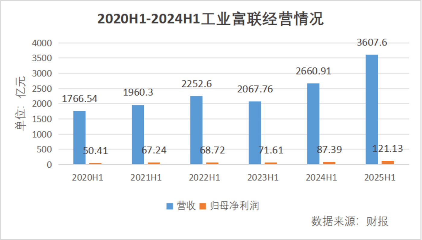 当然,孰增孰减并不重要,总量平衡才重要。这些年来,工业富联一直维持着相对满负荷的运转,财报数据显示 2020 年上半年工业富联的营收规模为 1766.54 亿元,归母净利润为 50.41 亿元,到 2025 年上半年两组数据分别增长到 3607.6 亿元与 121.13 亿元,CAGR(Compound Annual Growth Rate,年复合增长率) 分别为 15.35% 与 19.16%。