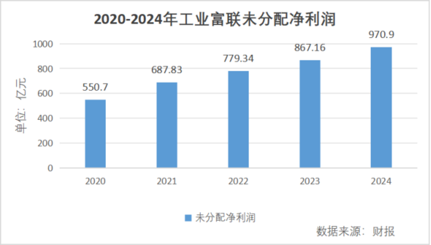 只看经营数据,自 2020 年以来工业富联归母净利润的 CAGR 已经超过同期营收表现。长期稳定的增长,不断抬高其安全系数。财报数据显示,2020 年-2024 年期间,工业富联的未分配净利润从 550.7 亿元一路增长至 970.9 亿元,整体趋势一路向上,CAGR 为 15.23%。