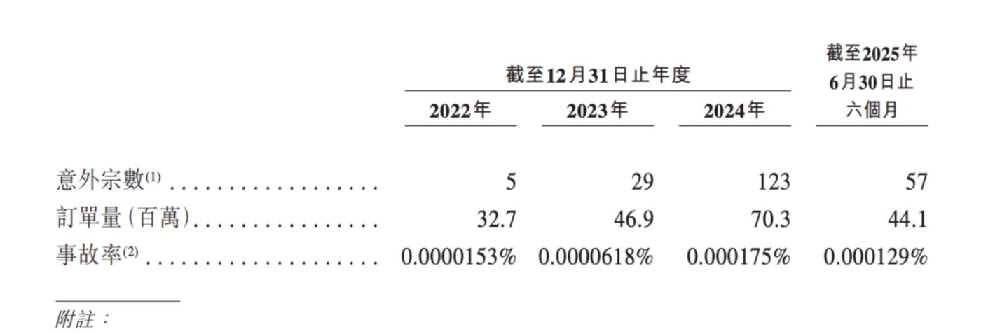 招股书披露,报告期内,盛威时代网约车业务订单数量从 2022 年的 3270 万单涨至 2024 年的 7030 万单,涨幅约 115%。但同期的意外宗数涨幅更多,从 5 起涨到了 123 起,涨幅高达 2360%(即增长 23.6 倍)!