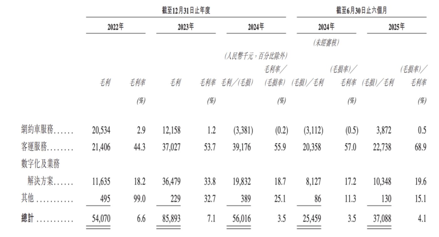 招股书显示,报告期内,网约车服务贡献了公司绝大部分营收,各期的营收占比分别为 86.2%、85.3%、88.9% 及 90.4%。但该项业务的毛利率很低,分别为 2.9%、1.2%、-0.2% 及 0.5%。