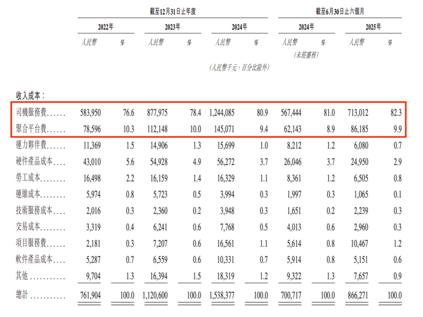 除了聚合平台费之外,盛威时代的另一项主要成本是与其网约车业务有关的司机服务费,从 2022 年的 5.84 亿元涨至 2024 年的 12.44 亿元,2025 年上半年为 7.13 亿元。