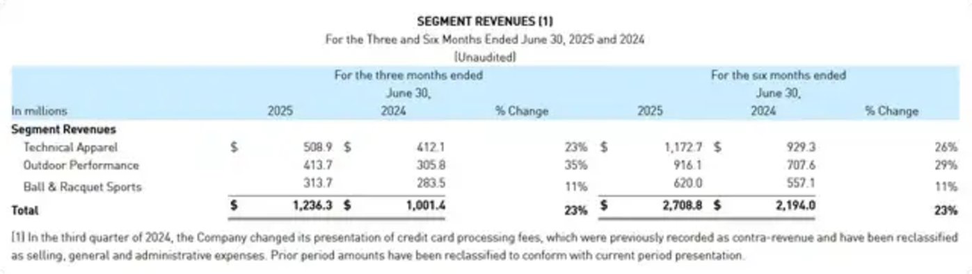 从商业角度看,根据始祖鸟母公司亚玛芬体育 (NYSE:AS) 发布 2025 年第二季度财务业绩,集团营收达 12.36 亿美元,同比增长 23%(此前预计增长 16% 至 18%) 其中,上半年实现营收达 27.09 亿美元,同比增长 23.46%。