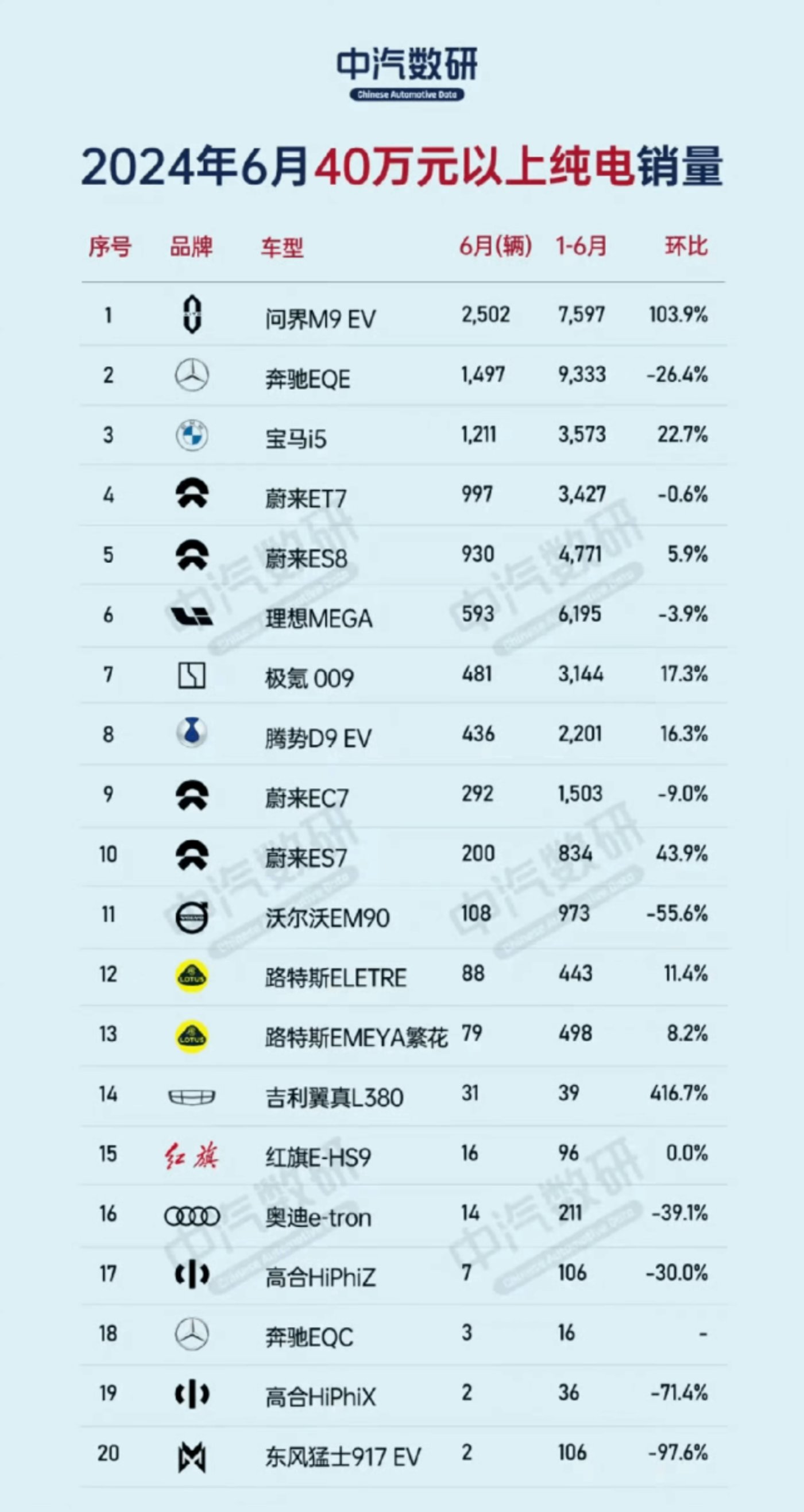 一份来自中汽数研的数据显示:在 40 万以上纯电市场,今年一至六月,即使是累计销量最高的奔驰 EQE,其累计销量也未破万,其累计销量仅为 9333 台;紧随其后的问界 M9EV 其累积销量为 7597 台,理想 MEGA 累计销量为 6195 辆,蔚来 ES8 累计销量为 4771 辆,蔚来 ET7 累计销量为 3427 辆。