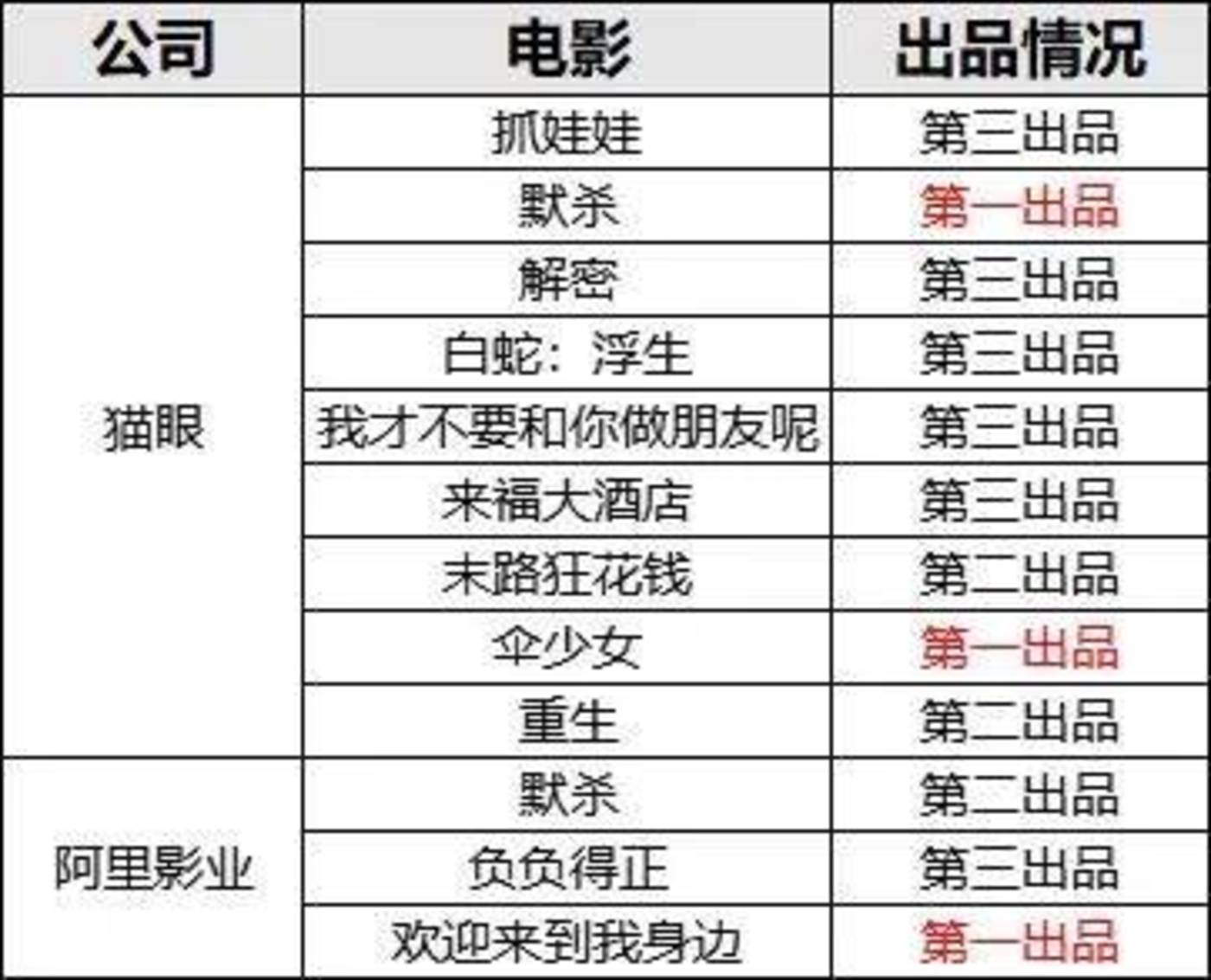 当然,猫淘虽占据市场优势地位抢占优质项目先机,在主控项目层面上却是实实在在的入门玩家。且两家公司在在担任前三出品的主出品业务布局上,也呈现出了不同的状态。