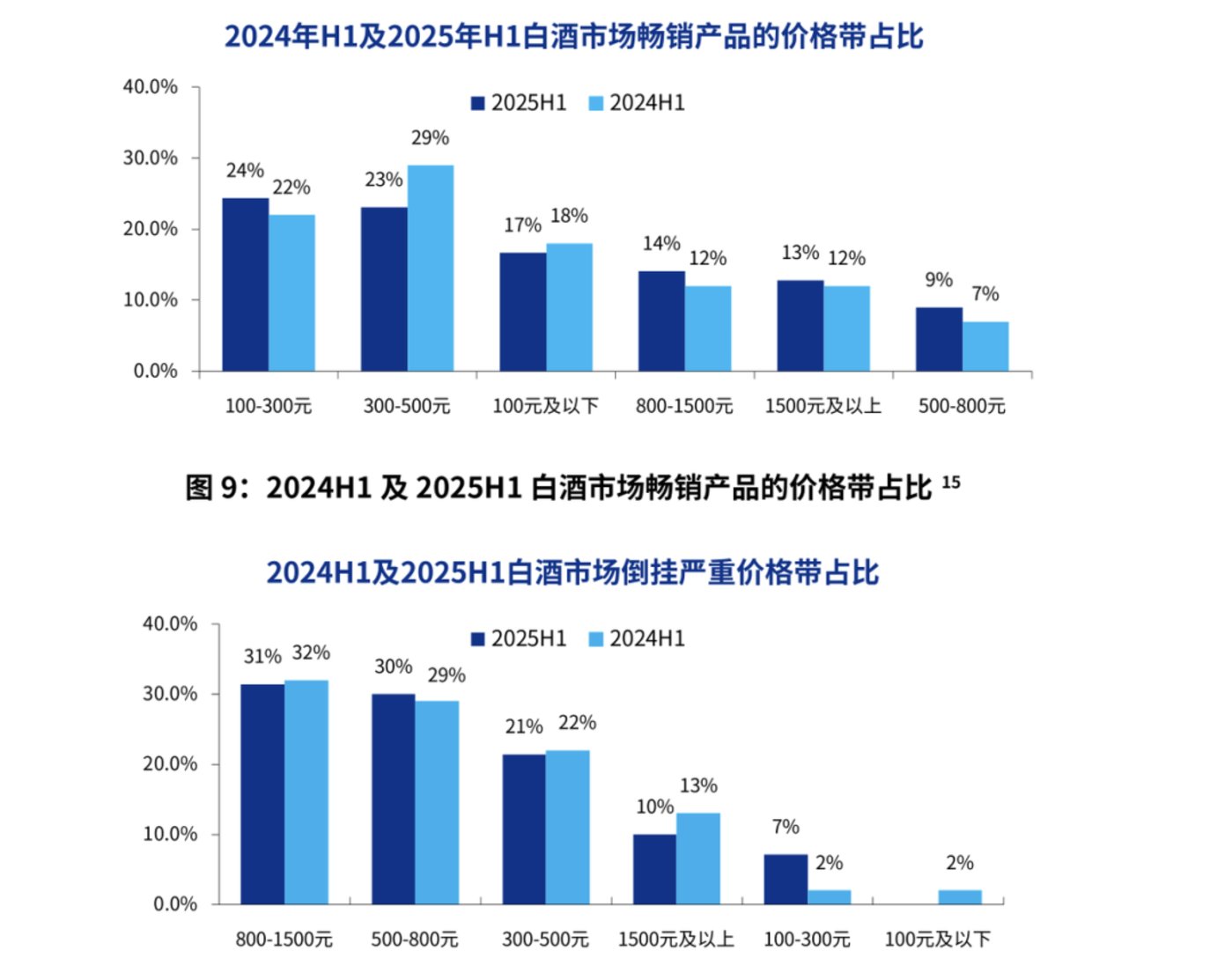 《2025 中国白酒市场中期研究报告》 显示,2024 年上半年销售最旺的三个价格带分别是 300-500 元、100-300 元及 100 元以下,2025 年,最佳动销价格带下移到了 100-300 元。倒挂程度最严重的仍然是 800—1500 元和 500 元~800 元价位带。