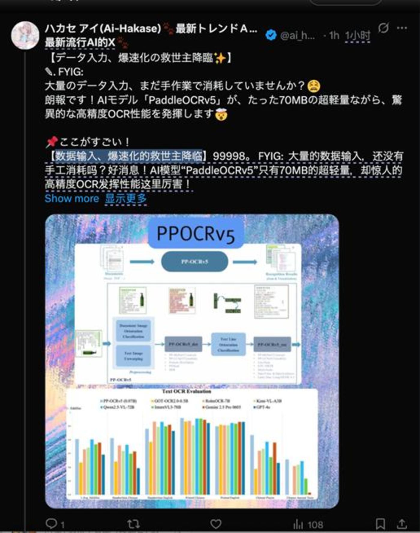 过去的一段时间里,和霸榜成绩接连出现的是一系列针对 PP-OCRv5 的海内外 「自来水」 评价,比如 Gizchina.com 锐评 「百度的 PP-OCRv5 表明,小型号仍然可以发光」,比如再比如来自一系列网友的称赞,如 「データ入力、爆速化の救世主降臨✨」(「数据录入,极限提速的救世主降临✨」)、「圧倒的性能でAIモデル「PaddleOCRv5」が、たった70MBの超軽量ながら、驚異的な高精度 OCR 技術を実装します」 (AI 模型 「PaddleOCRv5」 以压倒性的性能,在仅 70MB 的超轻量体积下,实现了惊人的高精度 OCR 技术) 等等屡见不鲜。
