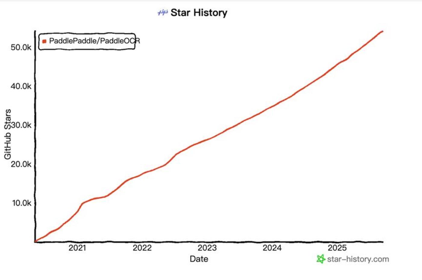 如果把时间线向回追溯,其实不难看到 PP-OCRv5 这次破圈背后行进轨迹,即其背后是刚刚登上 GitHub 全球总榜的社区明星选手 PaddleOCR,这个低调的国产 OCR 模型 GitHub Star 数从 2020 年开源以来一直呈现稳定、线性的增长。