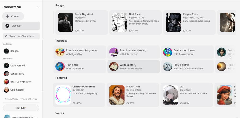 Character AI 是全球月活最高的 AI 虚拟陪伴类应用,聚集了一众 AI 角色,如黑手党老大、抓住你的冷酷杀手 Keegan(被小红书用户称为 「K 妈」)、随身保镖 Ghost 等等,由于角色性格丰满,对话灵活深入,调情自然,被很多中国用户称为 「赛博老公」。