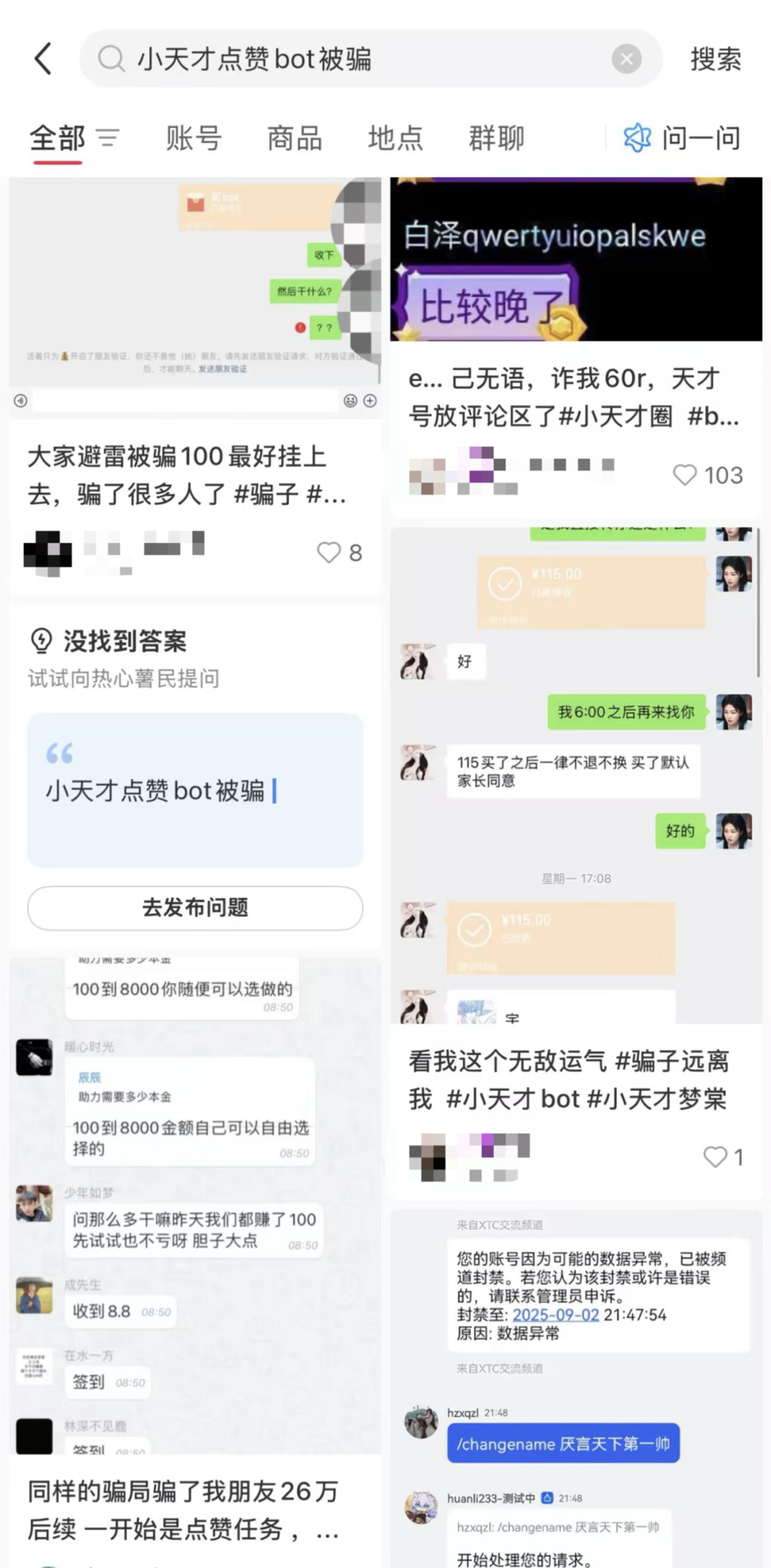 可这样的 「避雷」,真的有用吗?在他发帖之前,小红书上搜索 「小天才点赞 bot 被骗」,早有成千上百条的类似内容。可新的受骗者,仍然一个接一个地出现。