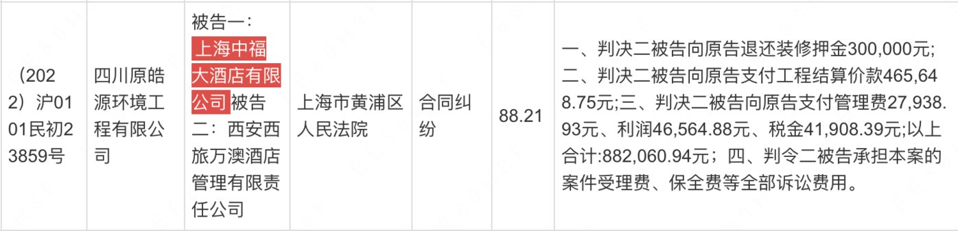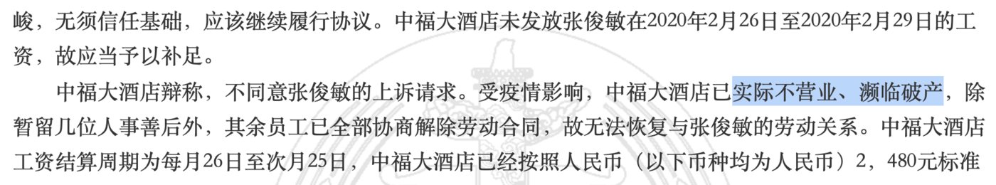 相关司法文书显示,「中福大酒店」 原本是一家普通商务酒店,其自称新冠期间一度 「已实际不营业、濒临破产」。