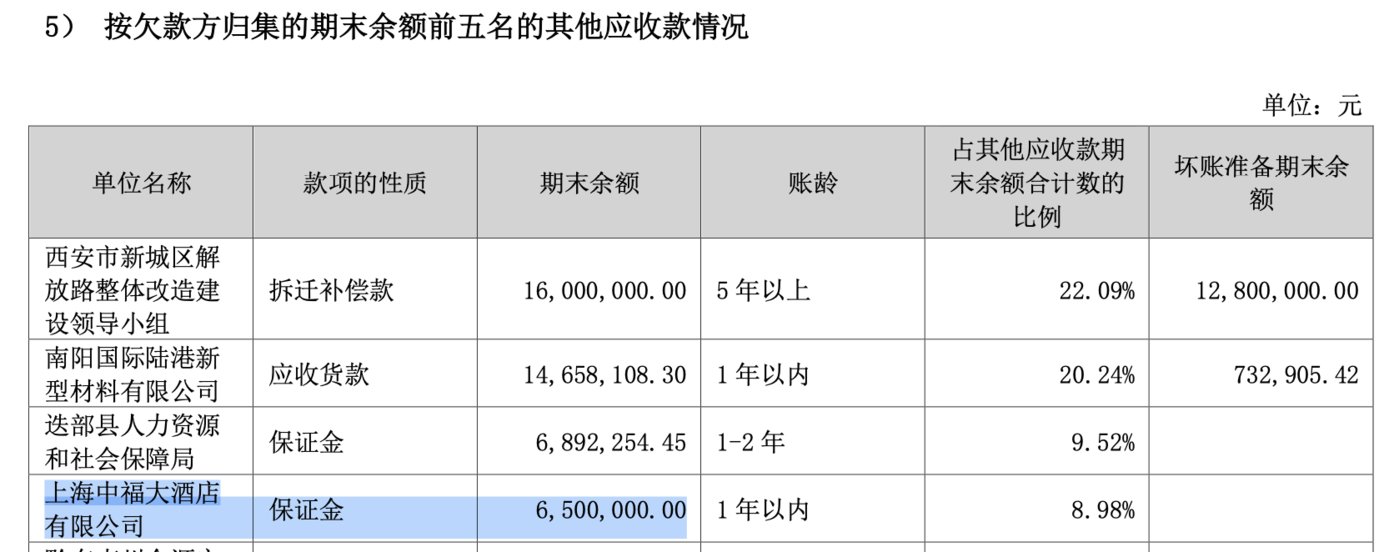 财报显示,2022 年上半年,上海中福大酒店有限公司成为西安旅游列第四位的 「欠款大户」,所欠 650 万款项显示为 「保证金」。