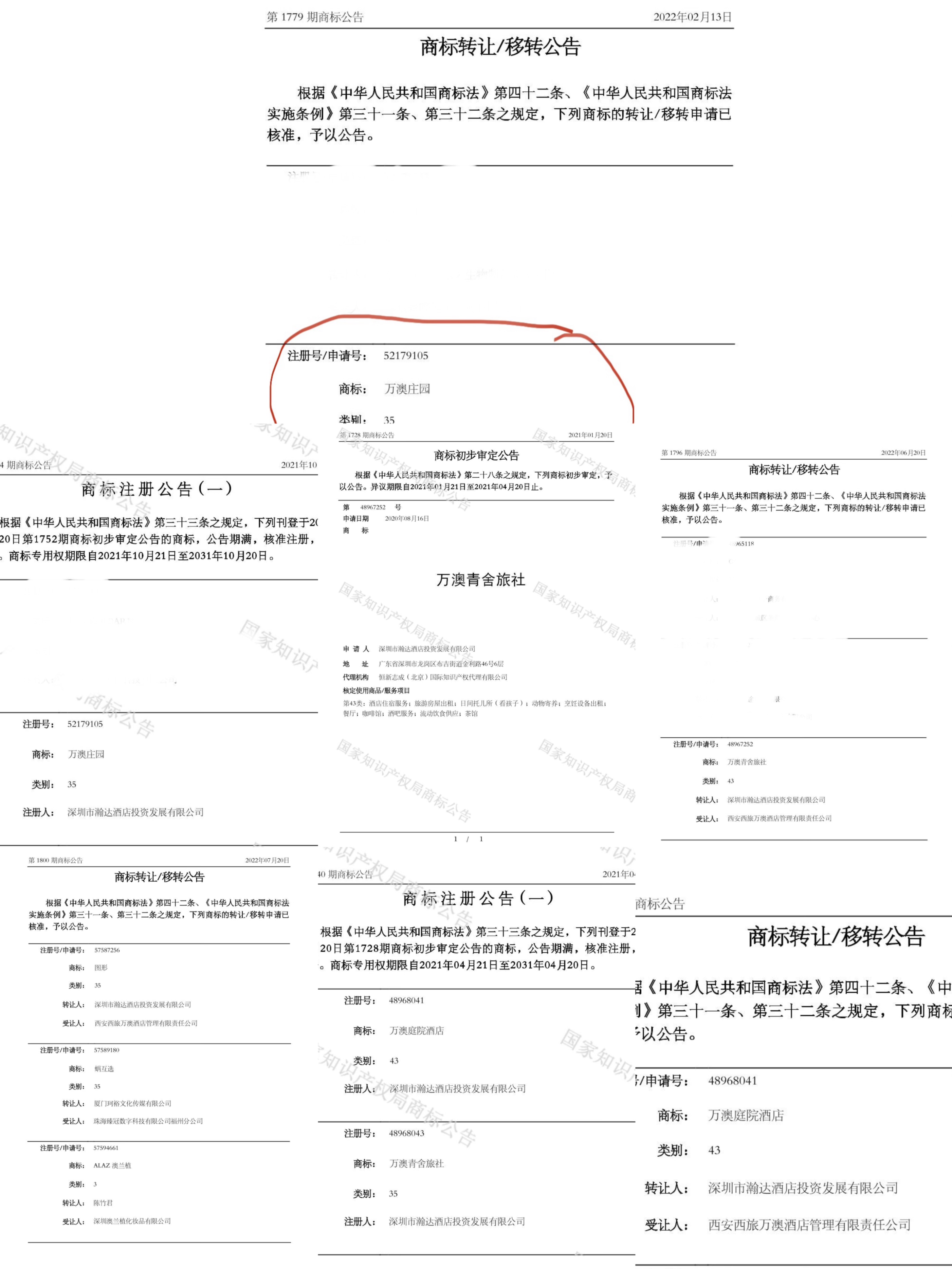 即便在三方已合作设立了西旅万澳公司之后,深圳瀚达还相继注册了 「万澳庄园」、「万澳庭园酒店」、「万澳青舍旅社」 及相关图形商标,都是在注册完成后再转让给西旅万澳公司,陆续构成西旅 「万澳系品牌矩阵」。