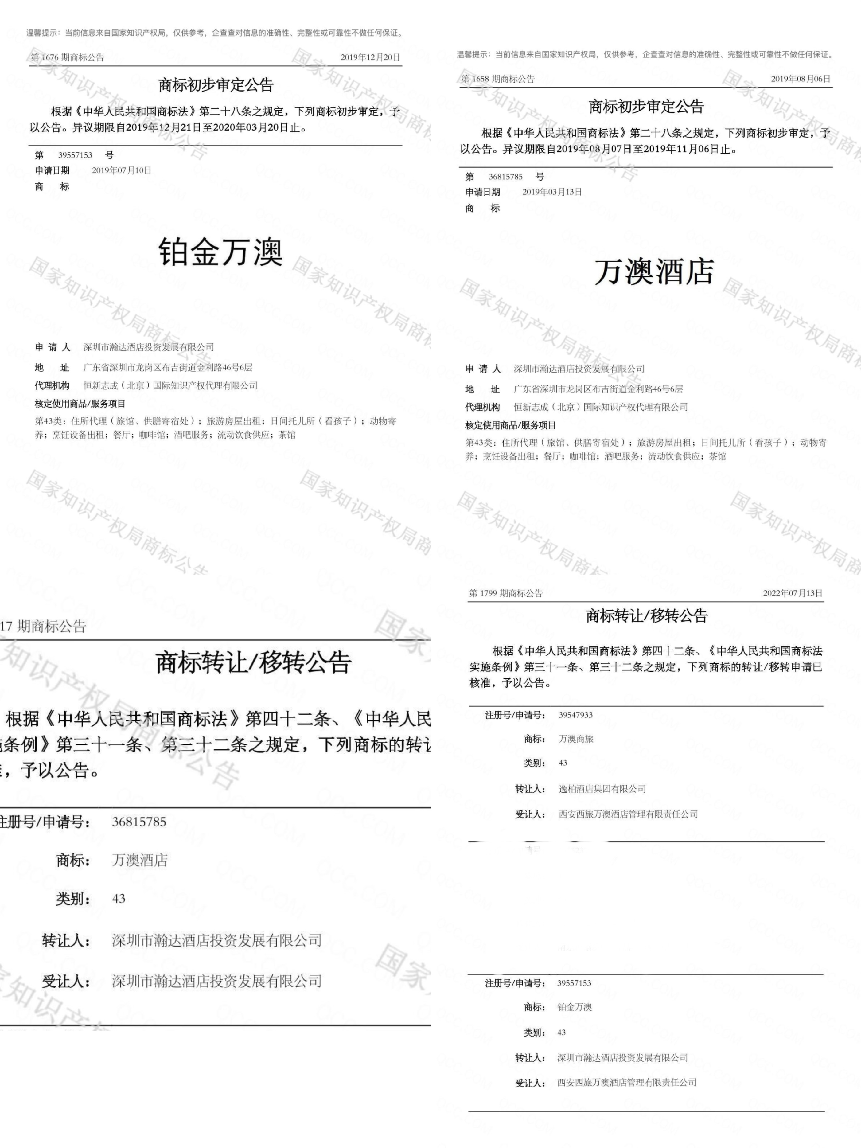 据中国商标网公示信息,2019 年 3 月,深圳市瀚达酒店投资发展有限公司 (简称 「深圳瀚达」) 申请注册 「万澳酒店」 商标 (以下均指 43 类、35 类),2019 年 7 月申请注册 「铂金万澳」,这两个商标均在当年获准申请后注册发文。