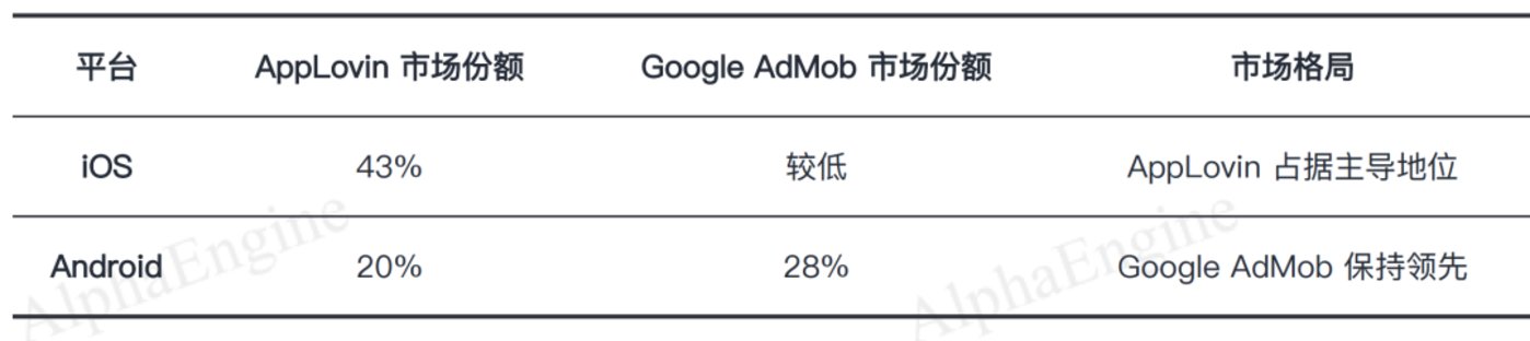 目前 AppLovin 已在 iOS 平台实现对 Google AdMob 的反超,占据主导地位;而在 Android 平台,Google 则凭借其生态优势保持领先。