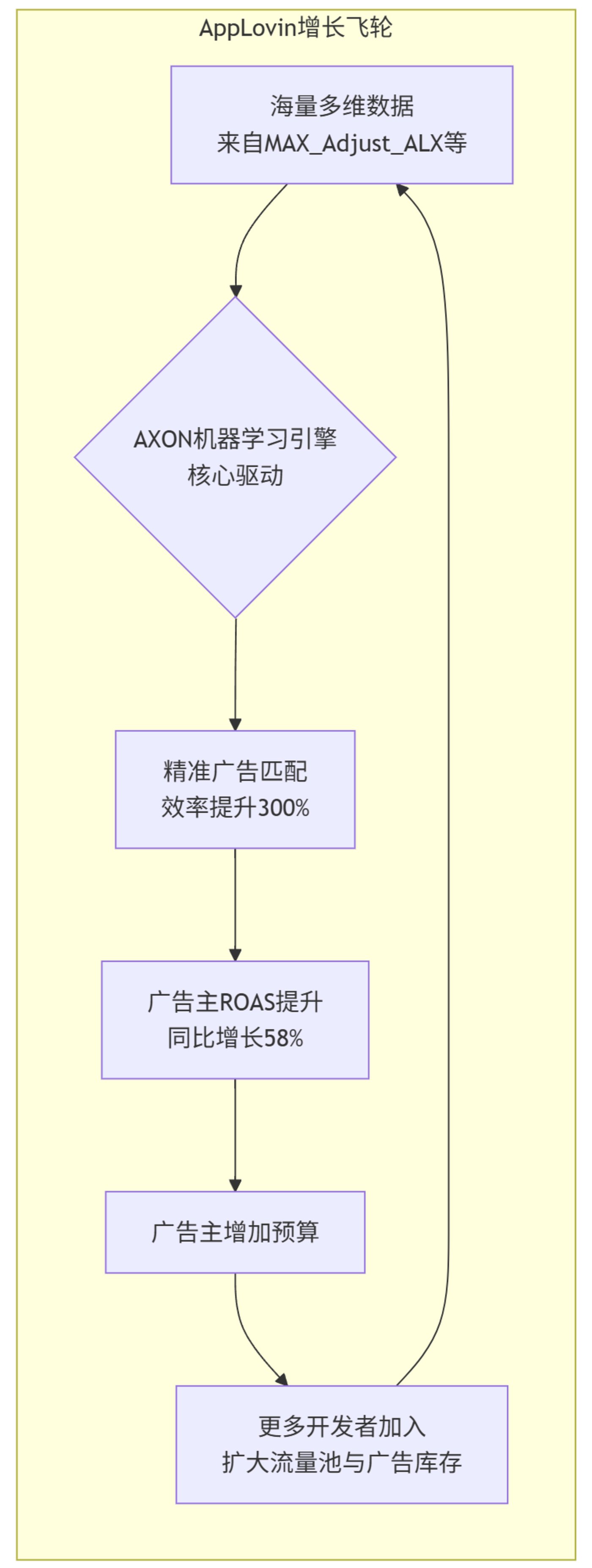 优异的投放效果吸引广告主持续增加预算,这又激励更多拥有高质量流量的开发者加入 MAX 平台,从而为 AXON 引擎提供了更多、更高质量的数据进行训练,进一步优化算法精度。