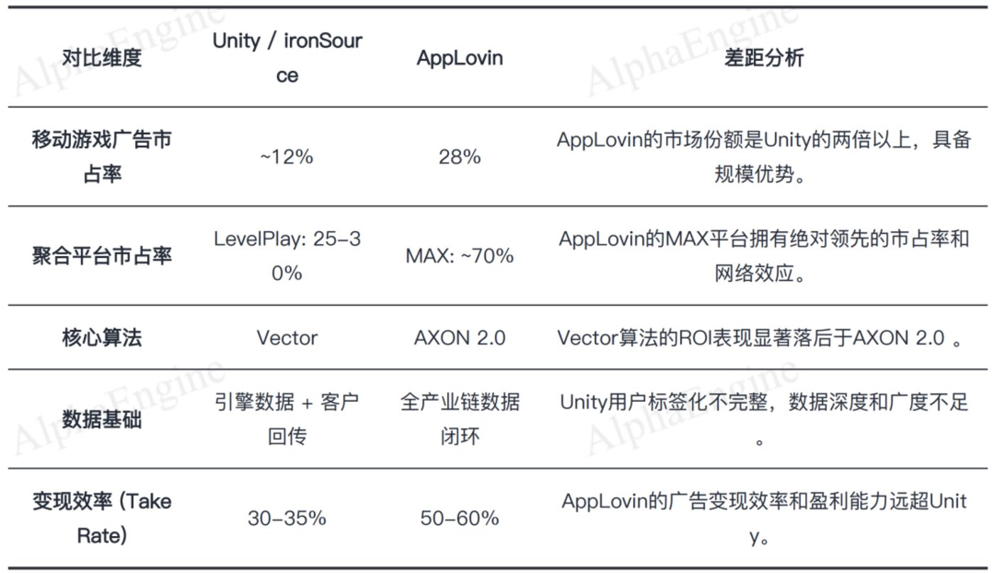 尽管具备结构性优势,但 Unity 在与 AppLovin 的直接竞争中,于技术和数据层面仍存在明显差距。