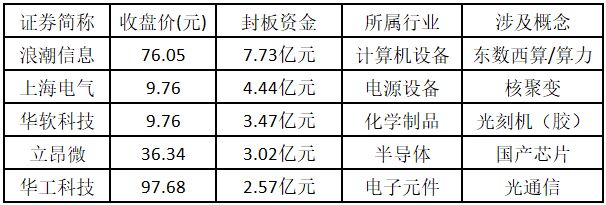 从封板资金来看,今日涨停板个股中,封板资金排名前 5 的个股包括浪潮信息、上海电气、华软科技、立昂微、华工科技。