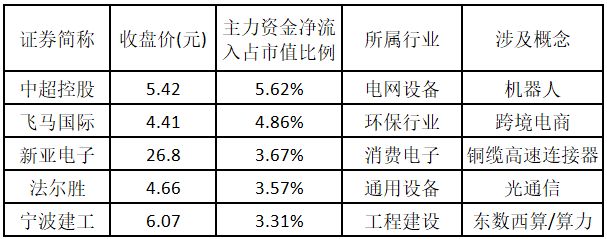 主力资金净流入金额占市值比例排名前 5 的个股分别为中超控股、飞马国际、新亚电子、法尔胜、宁波建工。