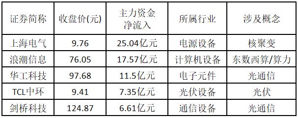 从主力资金来看,今日涨停板个股中,主力资金净流入金额排名前 5 的个股分别为上海电气、浪潮信息、华工科技、TCL 中环、剑桥科技。