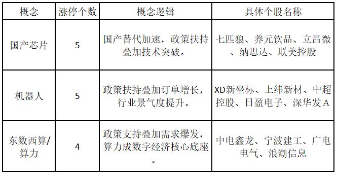 从概念特征来看,今日涨停板个股中,国产芯片、机器人、东数西算/算力概念的个股最多。