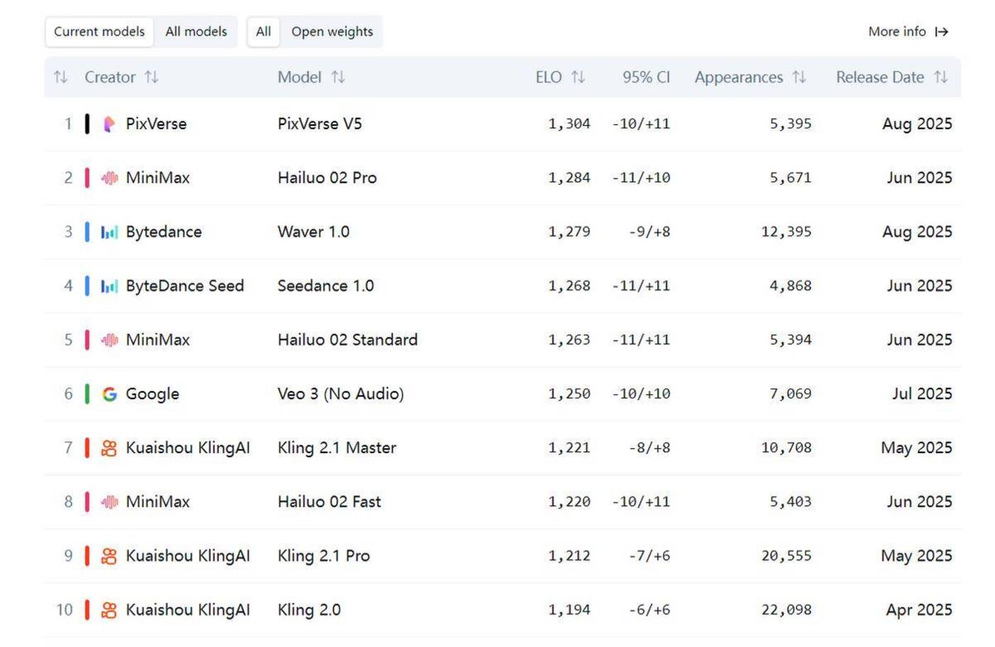其中,一个反直觉的表现是:在同样是今年 6 月、8 月的模型更新中,无论是文生视频,还是图生视频,「小厂」 爱诗科技们的排名反而要比字节们更好。