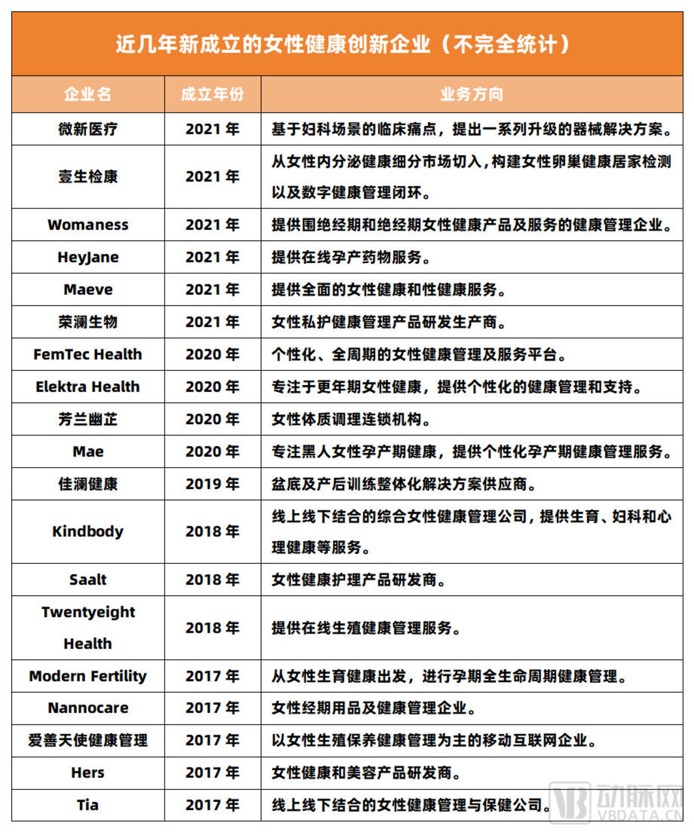 此外,动脉网也观察发现,近几年下场到女性健康管理赛道的创业企业络绎不绝,例如国外的 FemTec Health、Tia、Oova、Ava Women、Teal Health 等,以及国内的壹生检康、微新医疗、品嘉健康、恩视微、明兰世迦等。