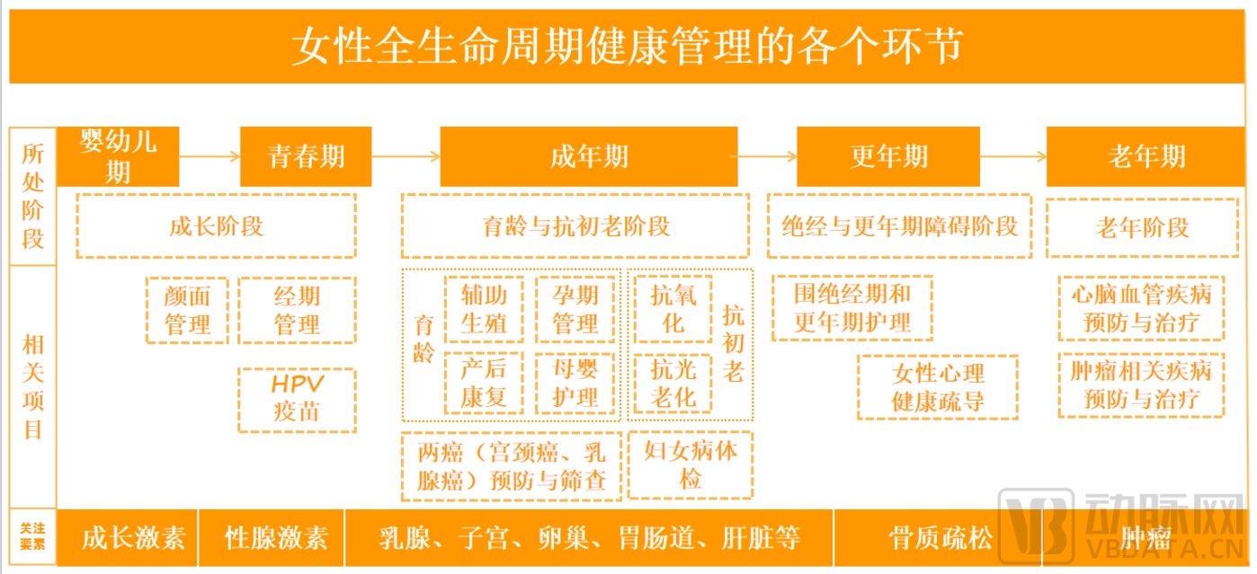 ▲女性全生命健康周期健康管理示意图 动脉网制图