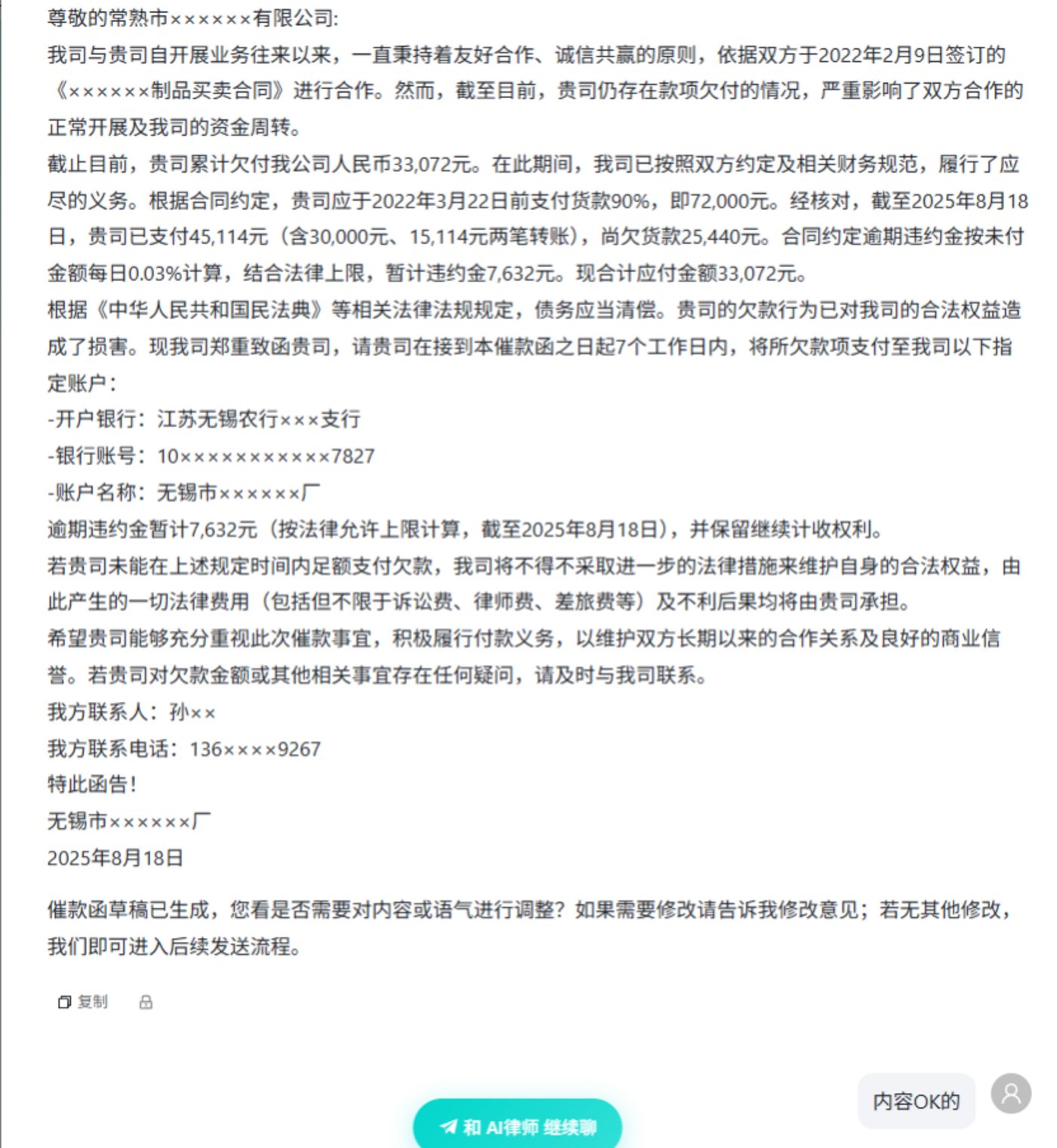 第一个是欠款追讨。比如你给客户供了货,对方拖着不付款,以前要么就算了,要么只能请律师,花个几千上万。现在你把把背景信息、合同等证据材料告诉吾律,它会直接帮你生成催款函、律师函,甚至诉状,也会帮你去和对方电话沟通。如果你真的要走立案环节,我们还能帮你对接律所。