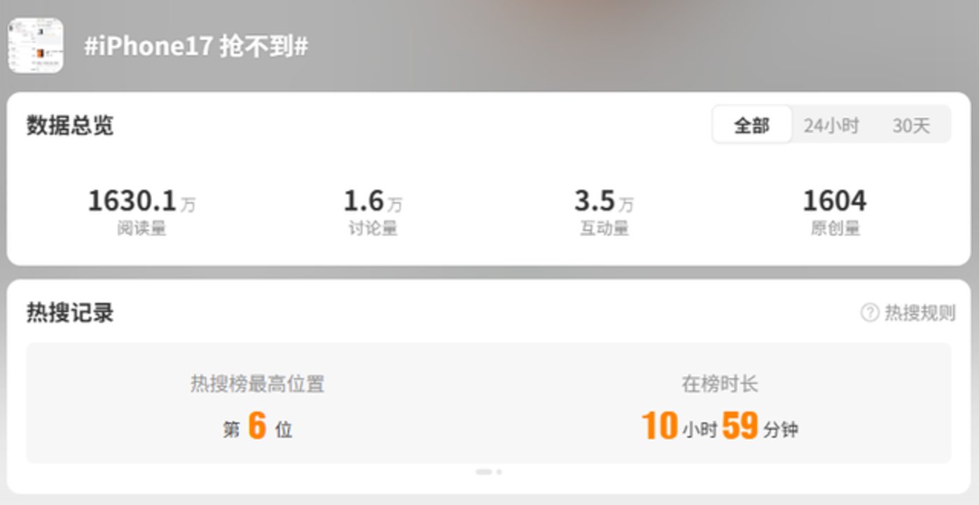最终,市场用最真实的反应回报了库克的 「诚意」,「iPhone 17 抢不到」 迅速冲上微博热搜,全渠道秒光,开售前全系列预约总量已然突破 700 万。