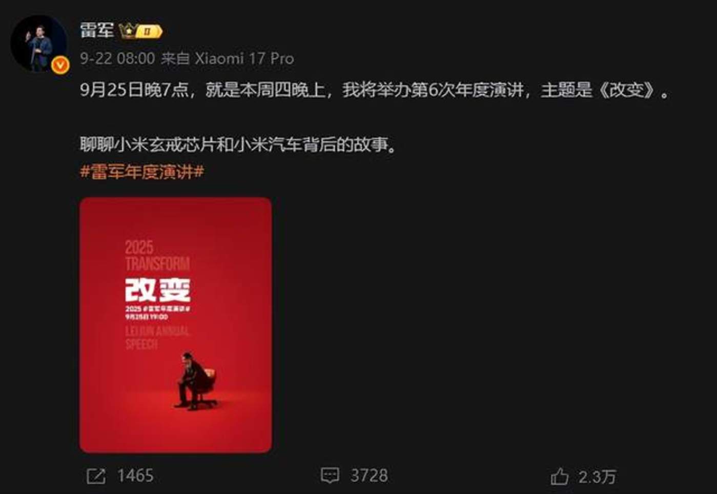 9 月 25 日,国家会议中心,小米公司创始人雷军带来了 《改变》 为题的主题演讲。