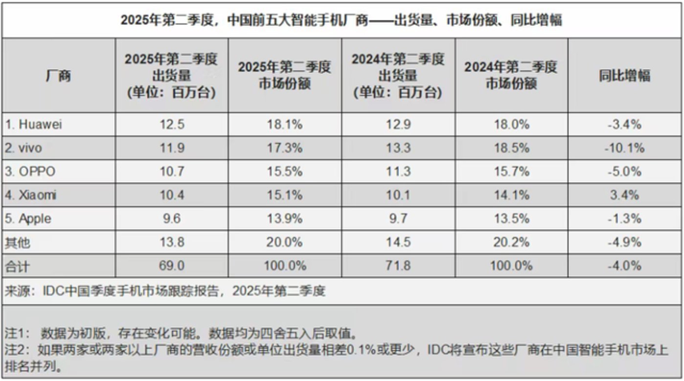 根据 IDC 的数据显示,就在 2025 年第二季度,华为已凭借 18.1% 的份额重夺中国市场出货量第一的宝座。而苹果,则以 13.9% 的份额,滑落至第五。华为的强势归来,成了苹果在中国高端市场 「躺赢」 时代的终结者。